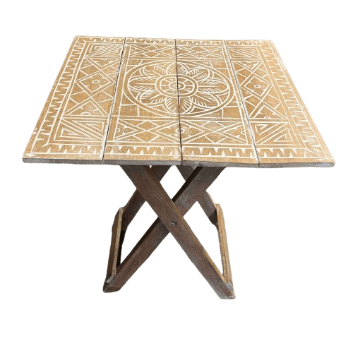 Este mesa tallada plegable presenta un diseño único y funcional, creado para quienes buscan piezas especiales que combinen estilo y practicidad. Su construcción asegura una excelente durabilidad para el uso diario.